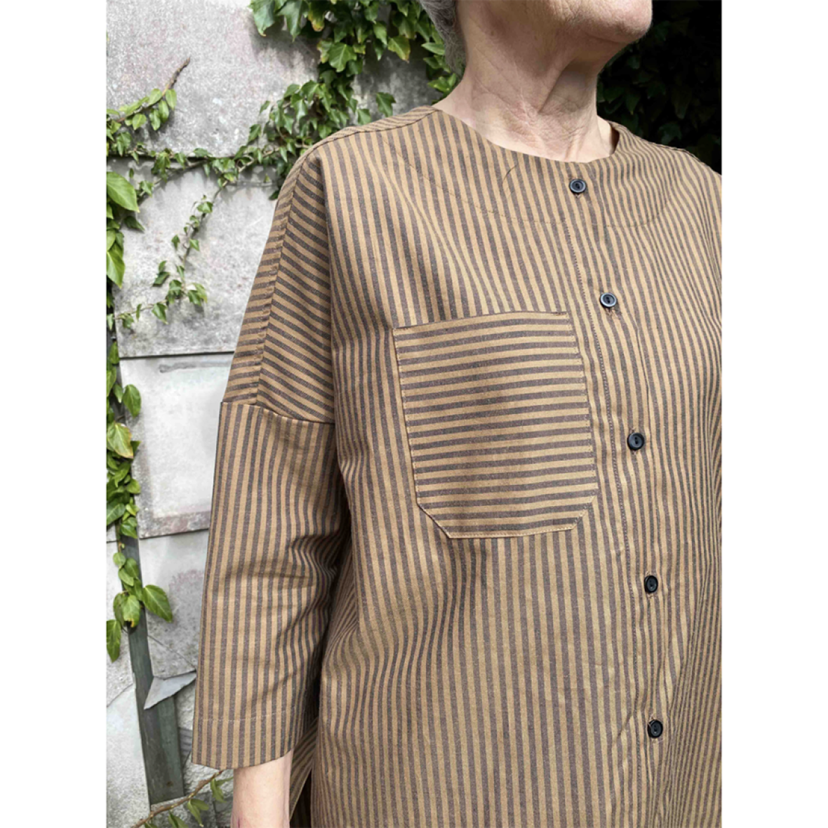 Sole Shirt er min version af den perfekte skjorte til både hverdag og festlige anledninger. Denne skjorte er lavet i en let og lækker stribet bomuld, som fås i de smukke farvekombinationer sort/brun og sort/hvid. Med ¾ ærmer og en elegant, asymmetrisk længde – længere bagtil end fortil – giver skjorten et moderne og sofistikeret udtryk.