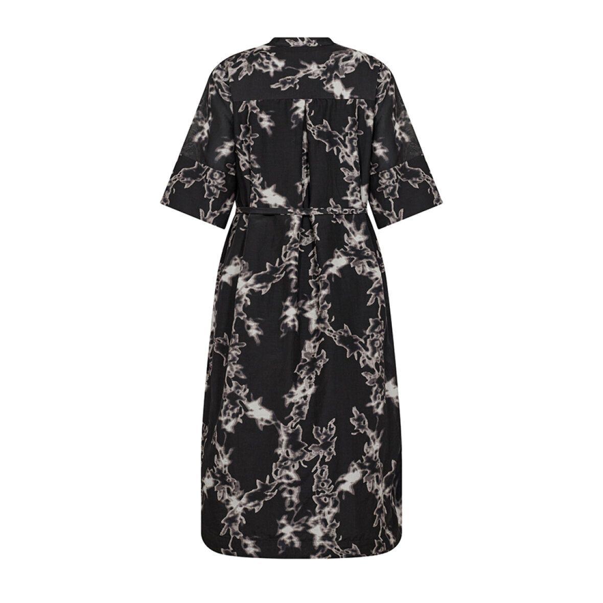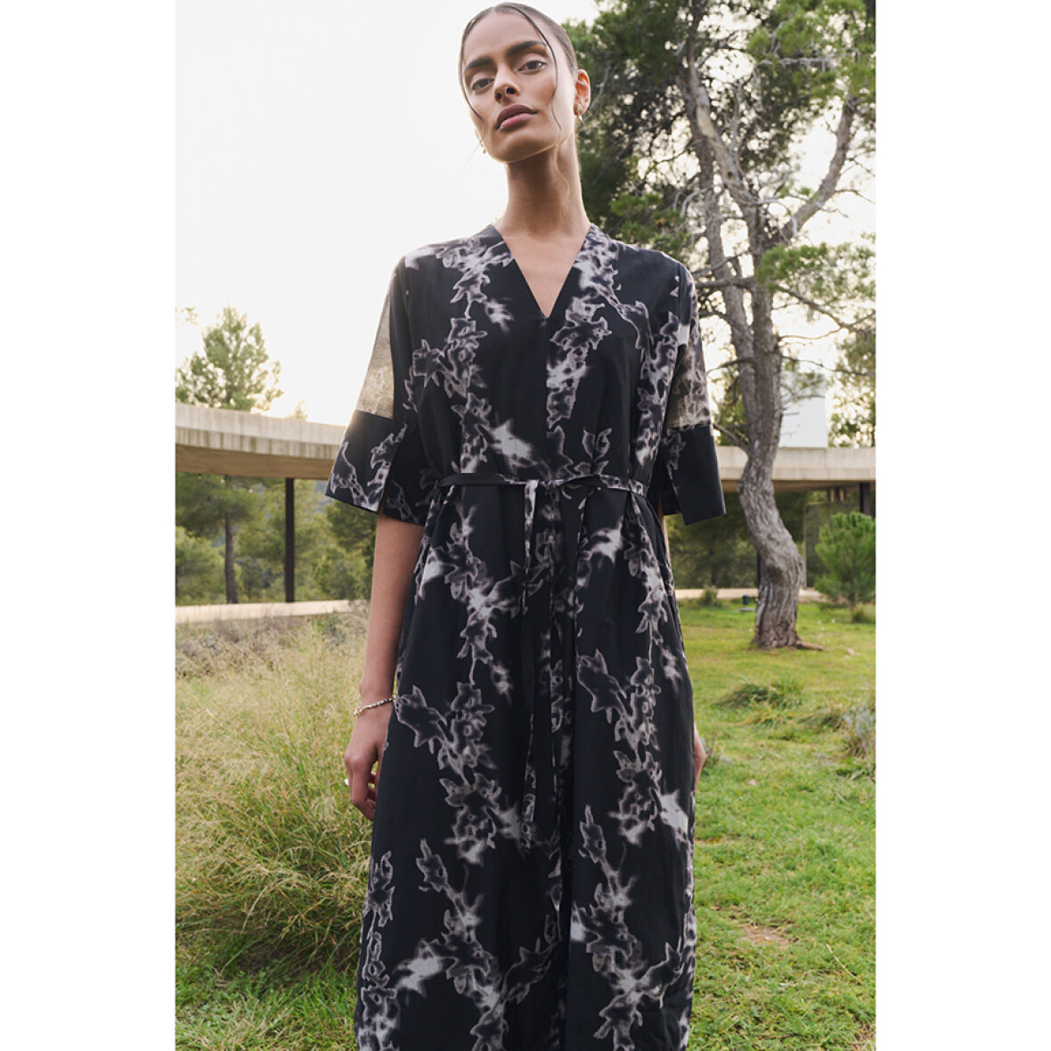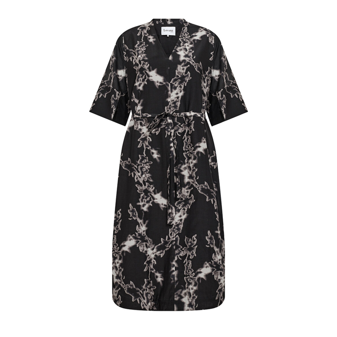 LR-NELSY 1 er en kjole fremstillet af 88% LENZING™ ECOVERO™-viskose, 12% polyamid. Den har V-udskæring, korte ærmer og bindebånd i taljen med mønstret print. Sæt den sammen med sandaler eller ankelstøvler for et behageligt look.