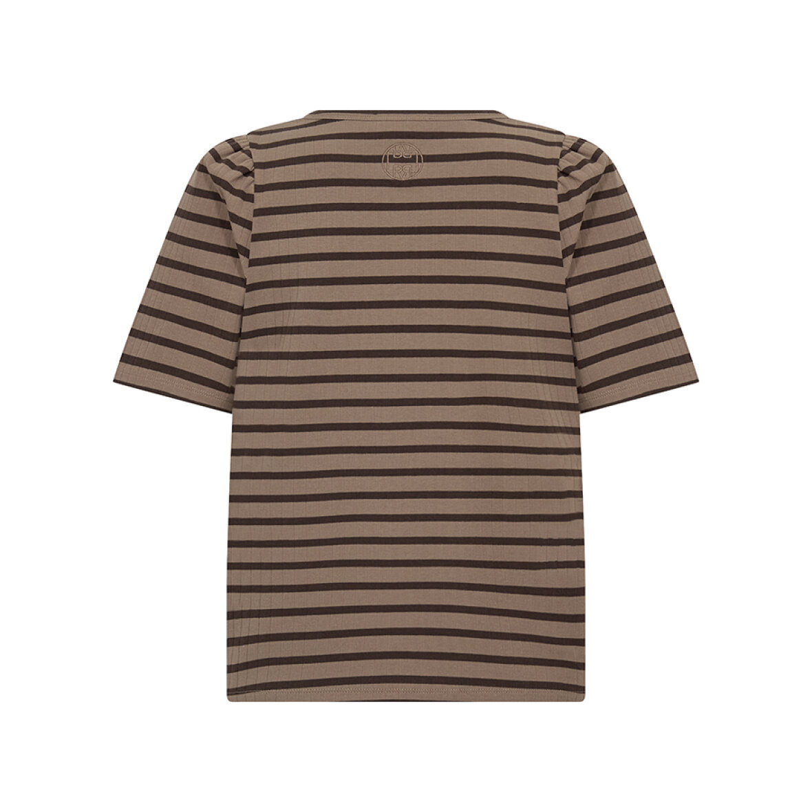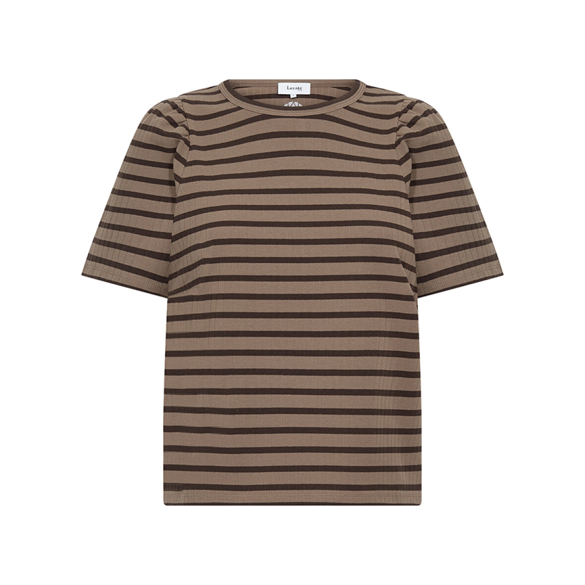 LR-NEDDIE 1 er en T-shirt fremstillet af 73 % økologisk bomuld, 21 % polyester og 6 % elastan. Den har en klassisk rund halsudskæring med et vandret stribet mønster og en almindelig pasform. Sæt den sammen med denim eller afslappede bukser for et afslappet look.