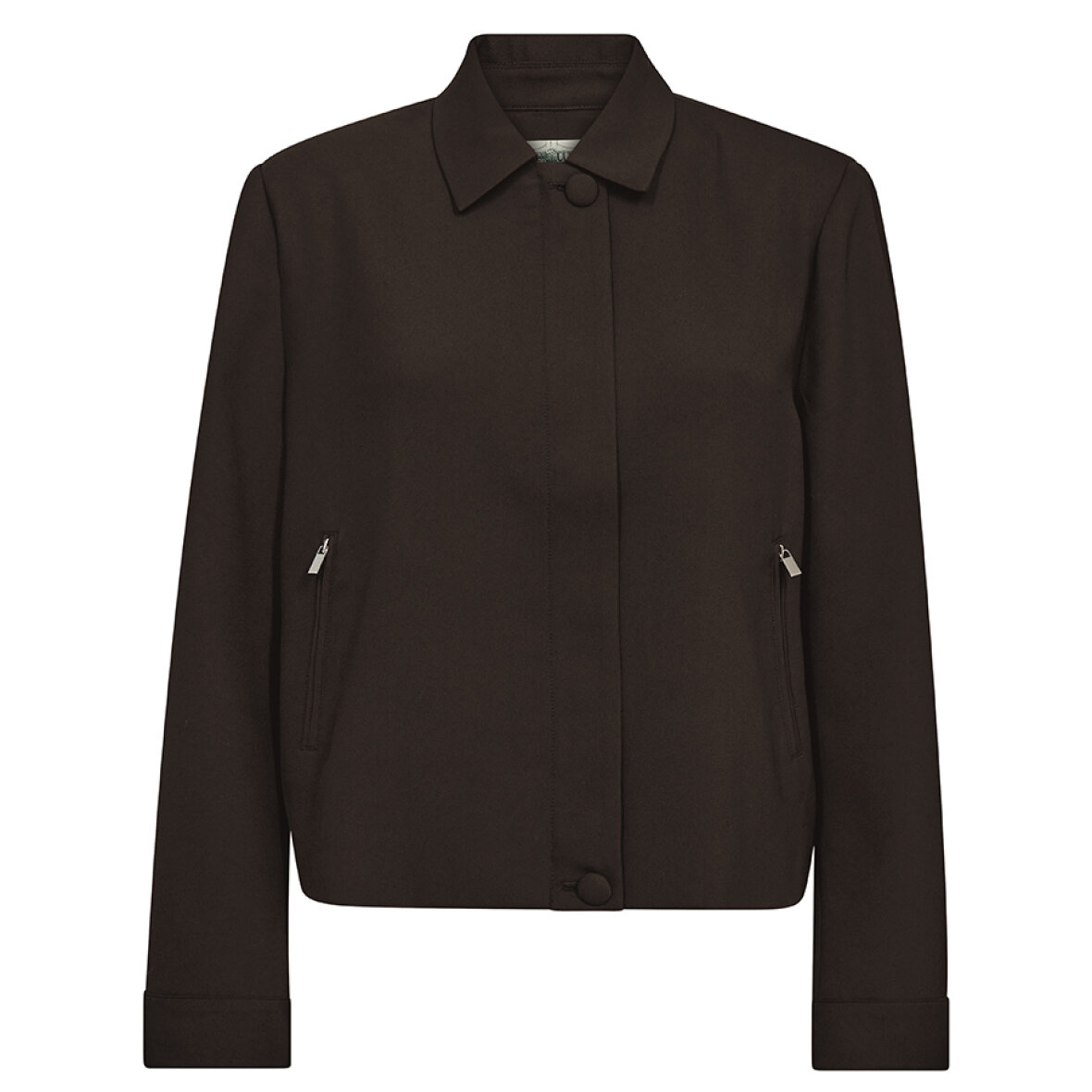 Denne elegante jakke giver den perfekte kombination af klassisk sofistikation og moderne stil. Den tidløse krave og skjulte frontlukning giver et skarpt og poleret udtryk. Subtile læg i ryggen, elastisk kant og stilrene lynlåslommer tilfører et moderne touch, hvilket gør den til en alsidig lag-på-lag favorit til enhver lejlighed.