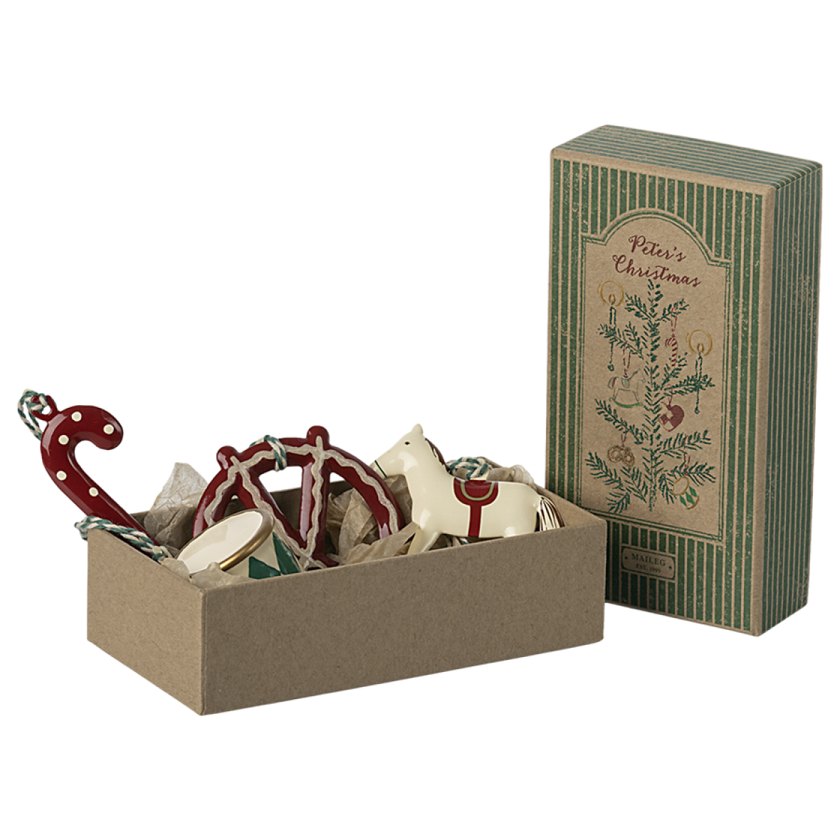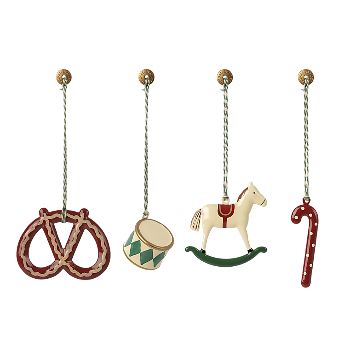 En perfekt gaveæske med 4 smukke Maileg metal ophæng. Hvert ophæng er pakket ind i silkepapir og gaveæsken er dekoreret med Dorte Mailil’s tegninger. Dette sæt indeholder en tromme, en sukkerstok, en kringle samt en gyngehest.