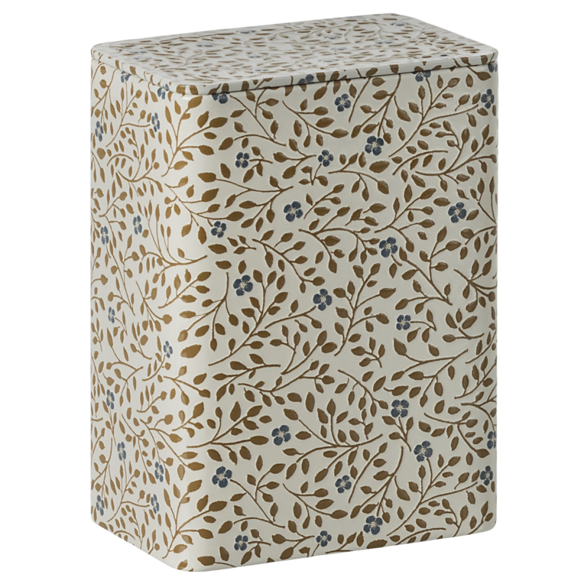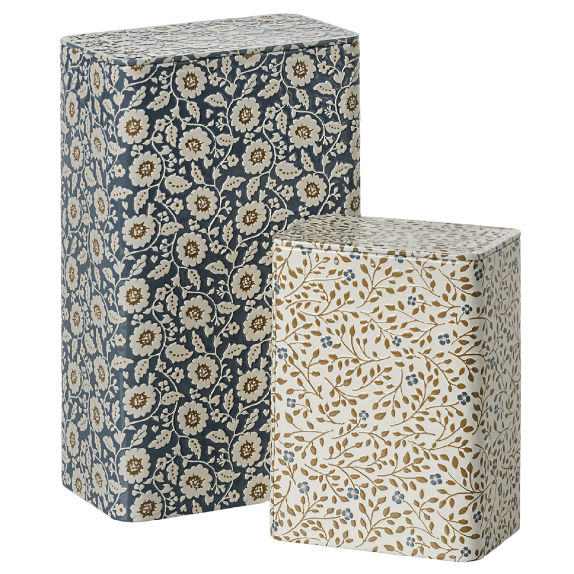 Smukt dekorerede dåser med blomsterprint og prægning. Den store dåse er en flot blå bundfarve og den lille i en lys brun farvetone. Smuk opbevaring til køkken eller stue.