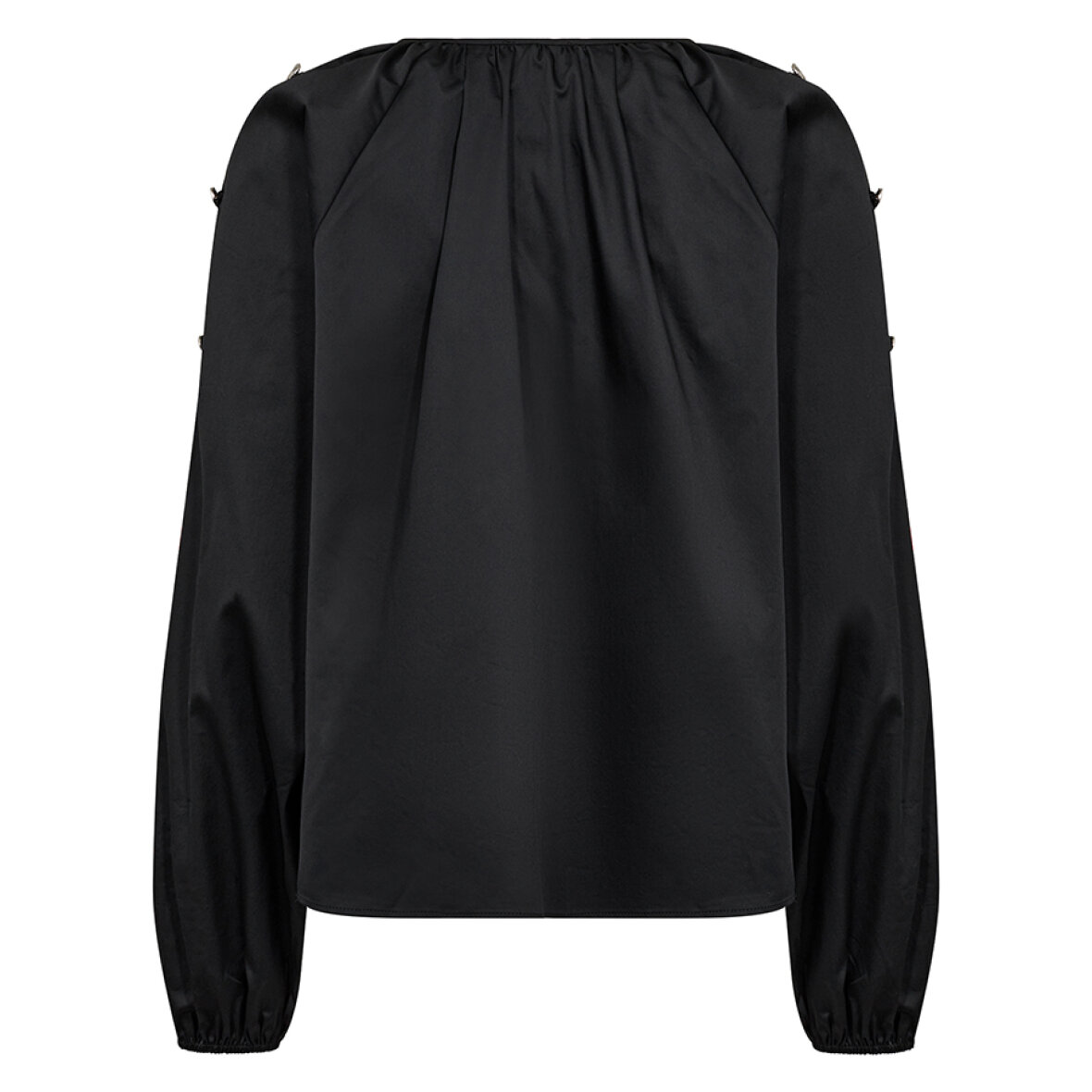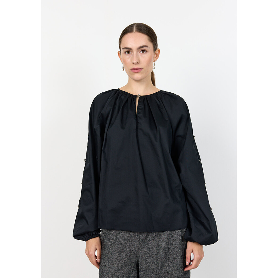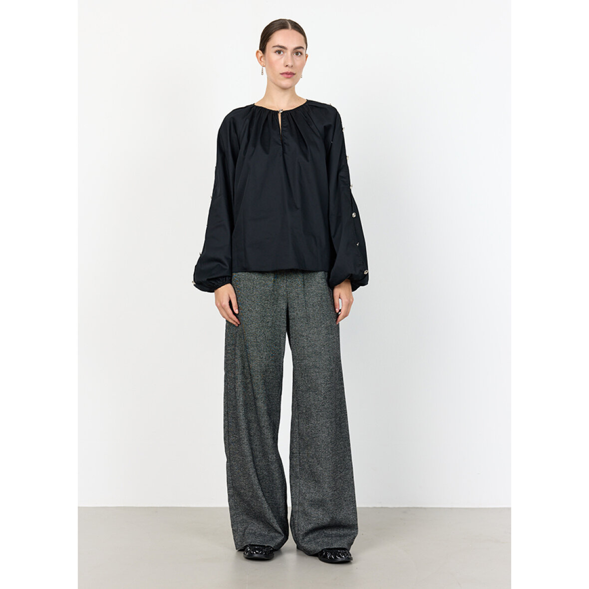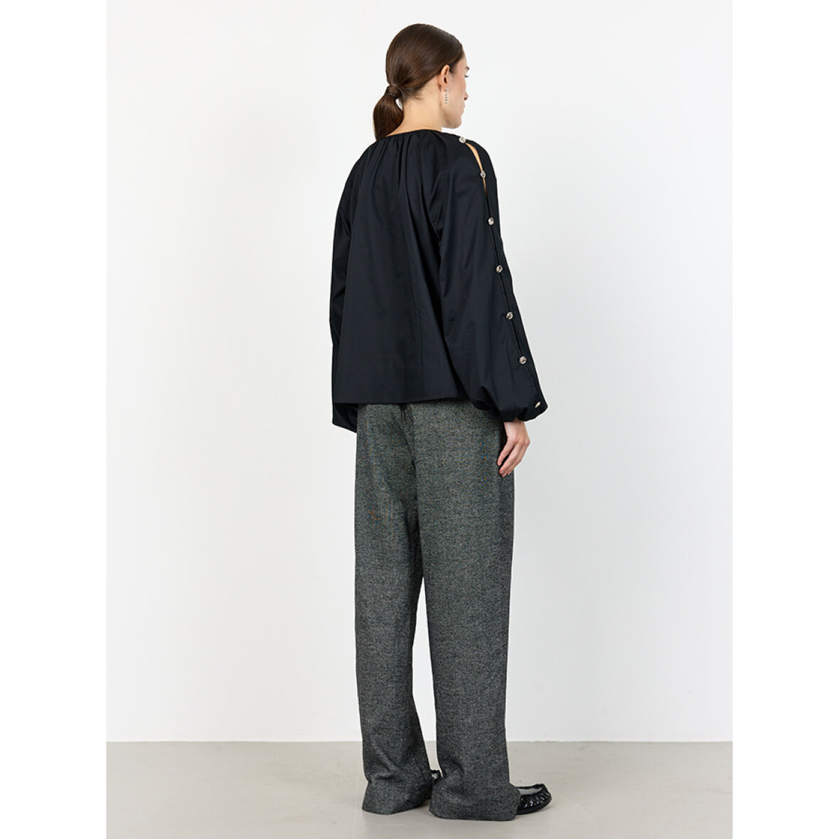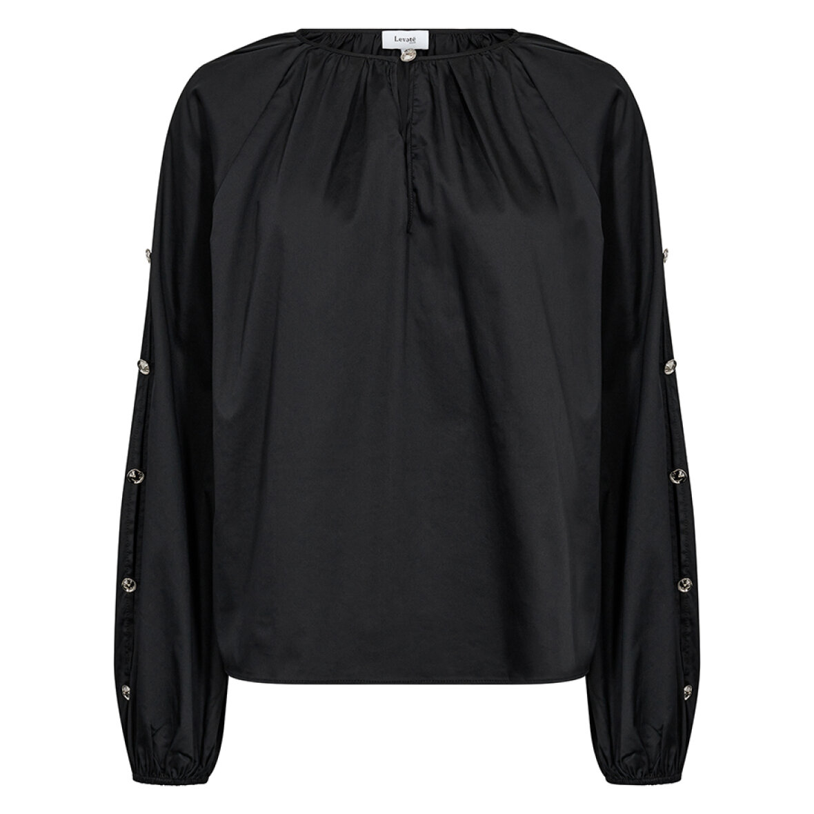 LR-ISLA SOLID 131 bluse er fremstillet af 65% økologisk bomuld, 30% polyamid og 5% elastan. Blusen har elegante knapdetaljer langs de lange ærmer og en rund halsudskæring med diskrete læg. Sæt den ubesværet sammen med skræddersyede bukser eller en elegant nederdel for et stilfuldt look
