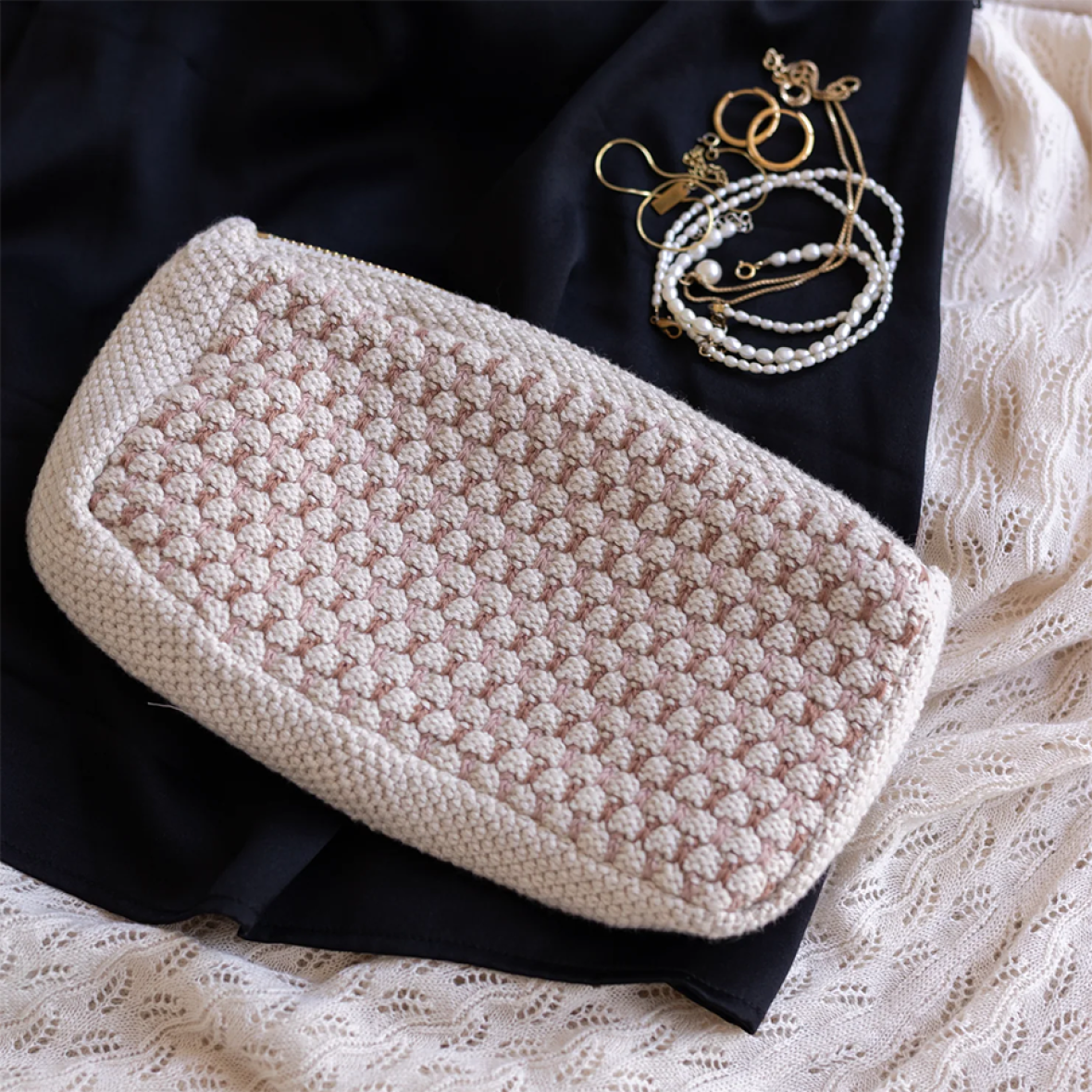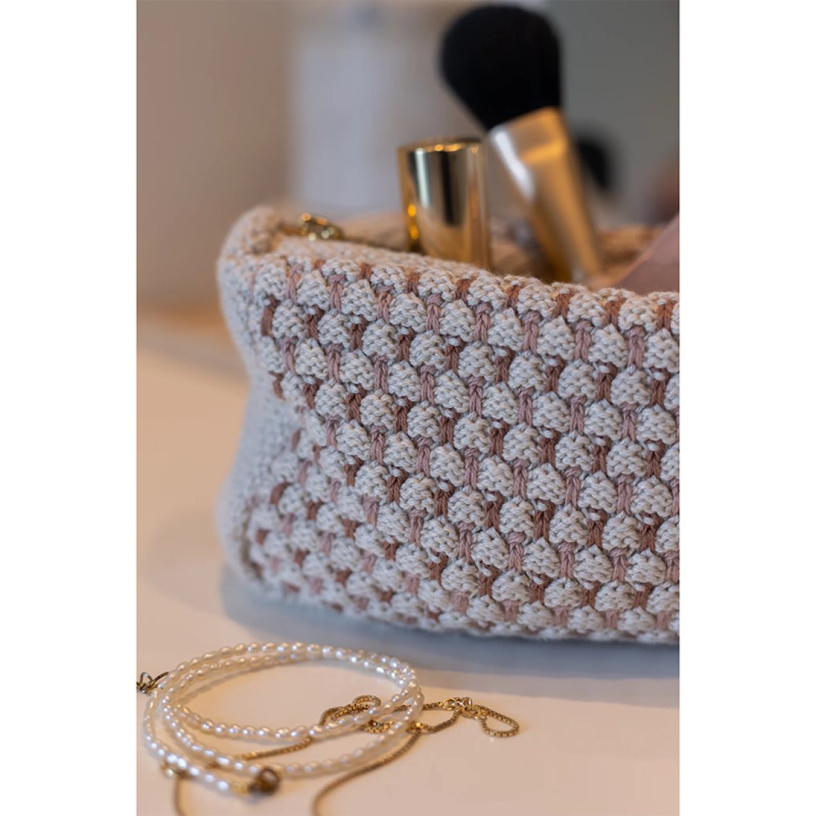 Clutchen er strikket i 100% økologisk bomuld i den smukkeste farvekombination beige - rose - brown sugar. Den er foret indvendig med ensfarvet bomuld. Clutchen har en lille åben lomme. Lukkes med lynlås (nikkelfri).