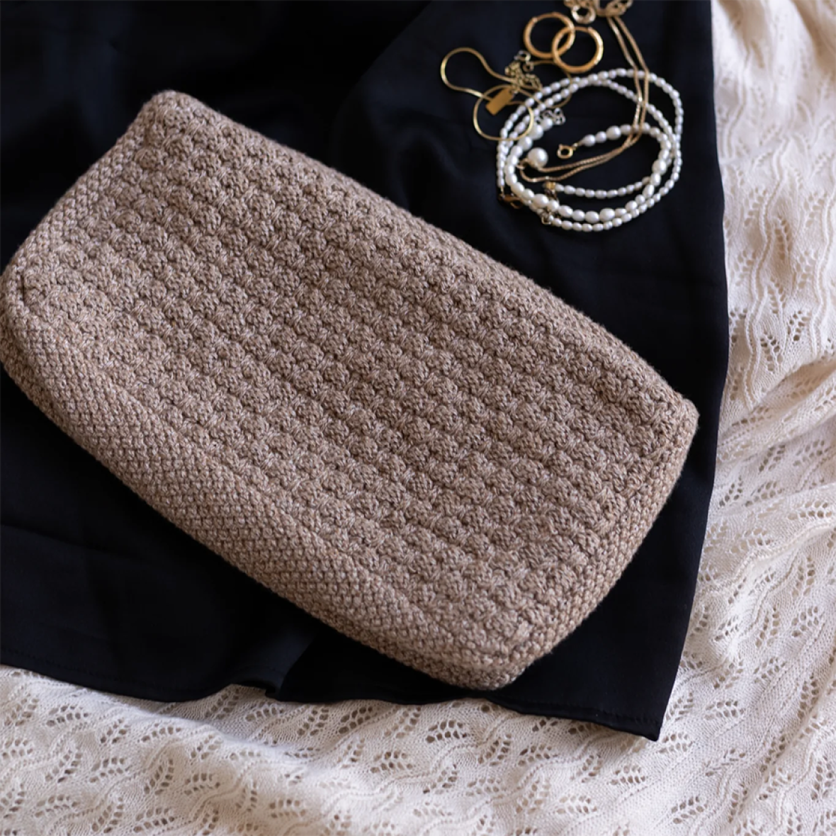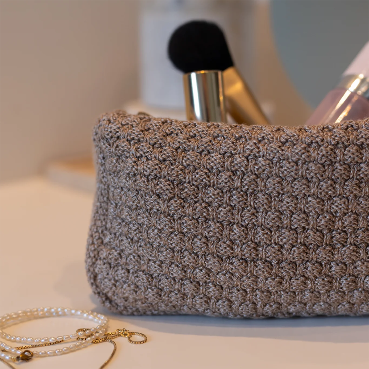 Clutchen er strikket i 100% økologisk bomuld i en af vores helt nye farver Tiger Melange. Den er foret indvendig med ensfarvet bomuld. Clutchen har en lille åben lomme. Lukkes med lynlås (nikkelfri).