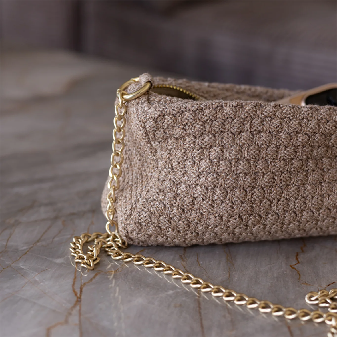 Clutch med sling kæde i vores nye farve Tiger Melange med regulerbar lænke i mat guld, nikkelfri. Lænken kan tages helt af, så du har en Clutch.