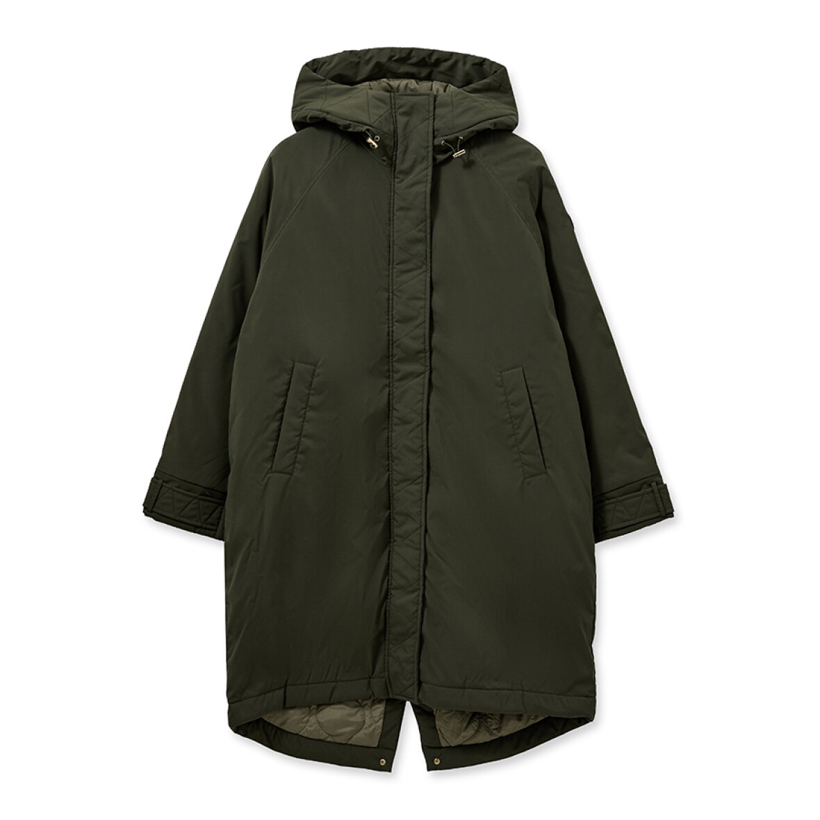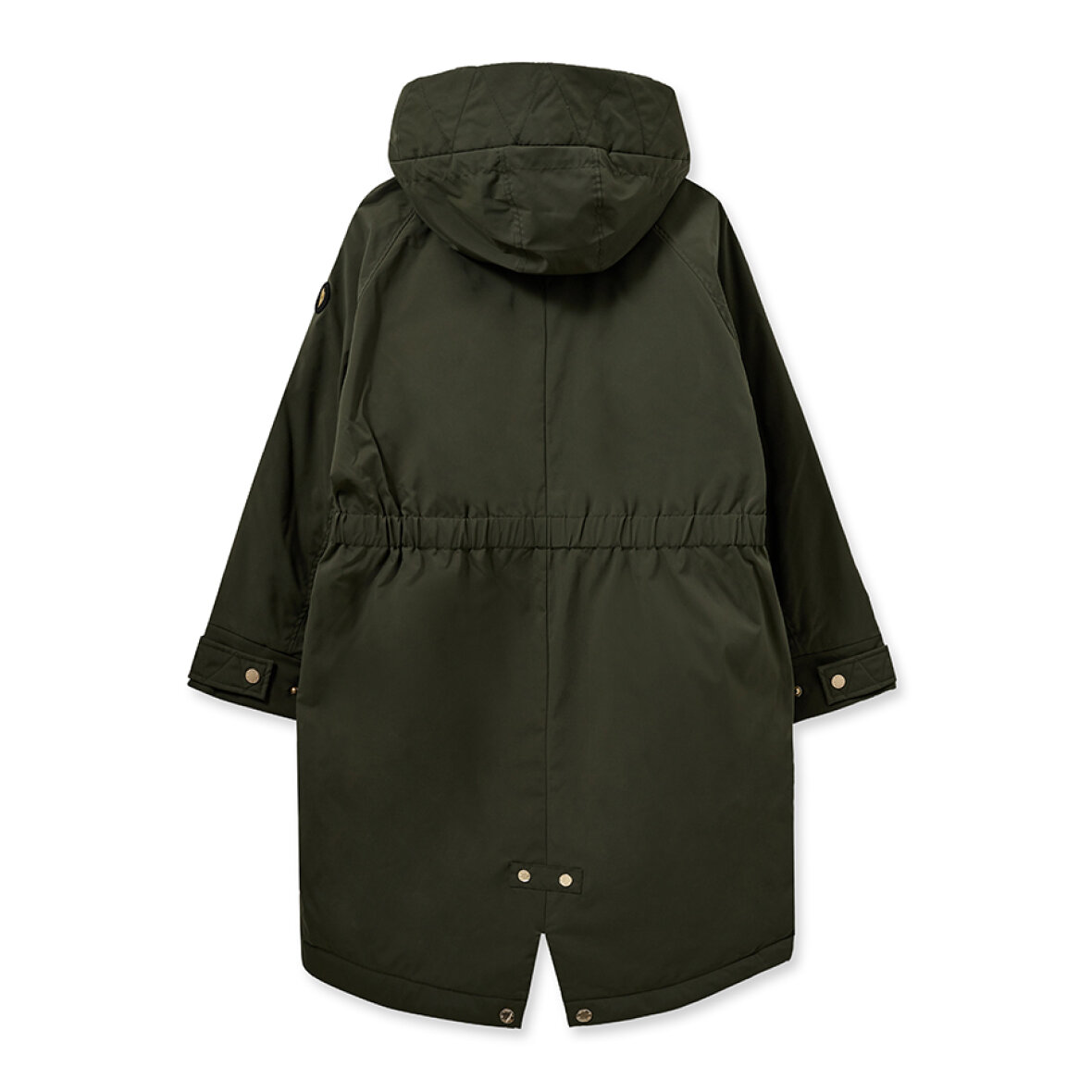 Denne model er designet i en afslappet, oversize pasform med et quiltet foer, der holder dig varm på kølige dage. Jakken har lynlåslukning, en stor hætte og justerbare snore i taljen, så du nemt kan tilpasse pasformen. Det vandafvisende materiale gør den perfekt til efterårsdage med skiftende vejr.