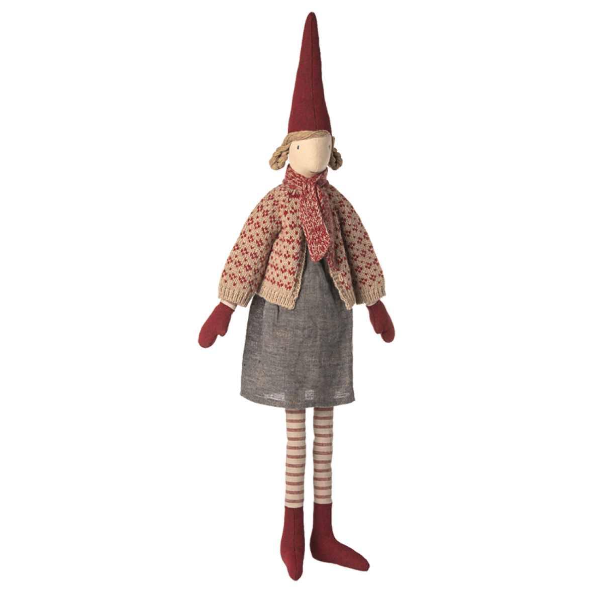 Denne nissepige i størrelse 4 fra Maileg er en del af den klassiske nissekollektion. Hun er klædt i nederdel og cardigan, som giver et varmt og traditionelt udtryk, der passer perfekt til julens hyggelige stemning.