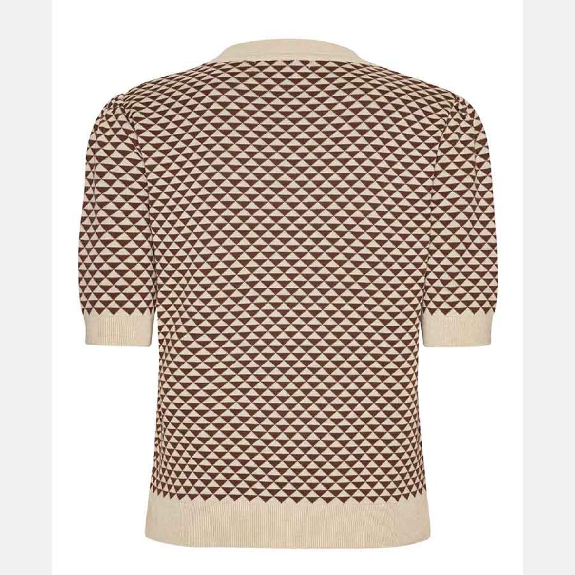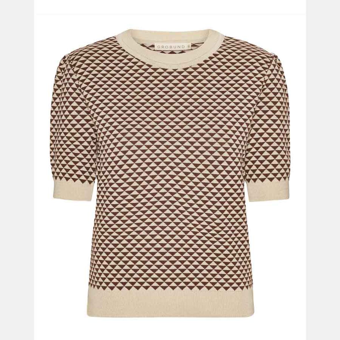 T-shirten er strikket i en lækker tyk bomuldskvalitet, der føles blød og naturlig på kroppen. Det grafiske mønster er i råhvid og en chokoladebrun farve – en skøn kombination.