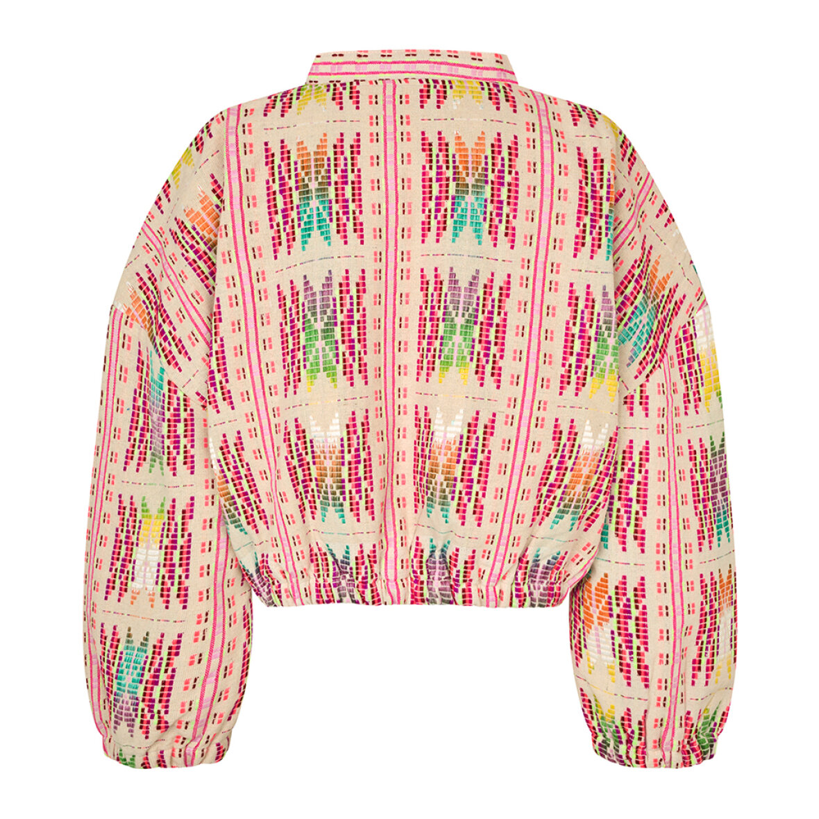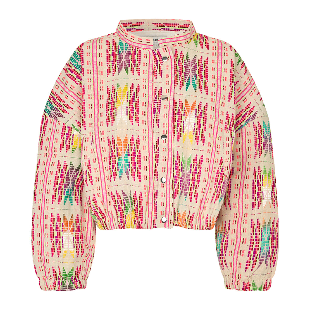 LamaLL er en farverig jakke, der giver dit outfit et personligt og kunstnerisk twist. Det smukke vævede mønster i klare, levende farver skaber et unikt udtryk, som gør jakken velegnet til både hverdagsbrug og særlige anledninger. Jakken er fremstillet i en let og behagelig kvalitet, der gør den ideel til lag-på-lag styling over kjoler, skjorter eller en enkel T-shirt. Metalknapper med tryk foran giver et råt modspil til det farverige design, mens elastik i taljen og ved manchetterne sikrer en komfortabel og flatterende pasform. LamaLL er et ægte statement-piece, der tilfører garderoben masser af personlighed og farve.