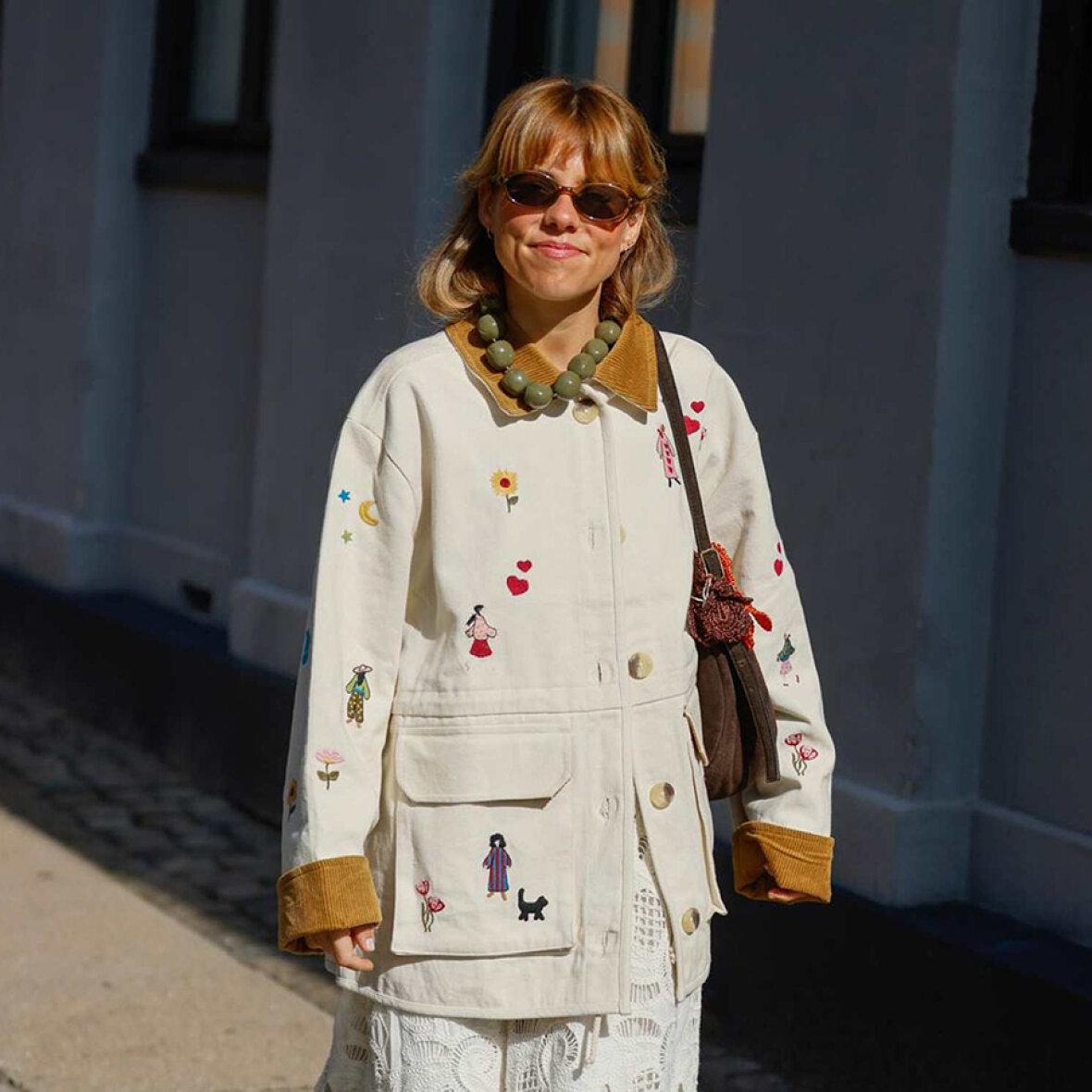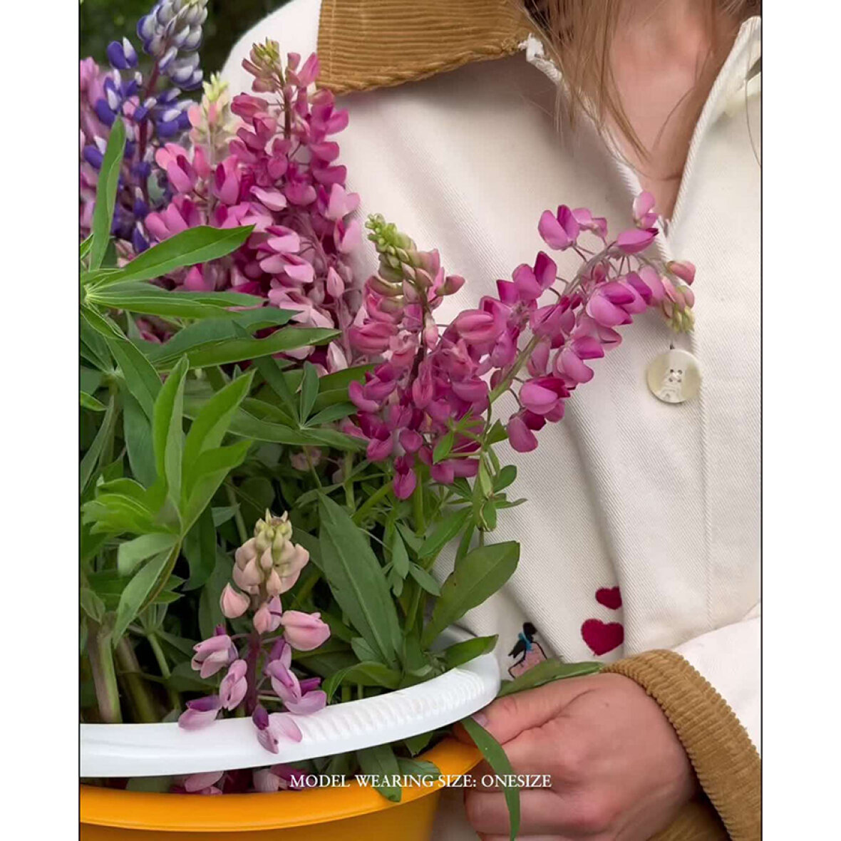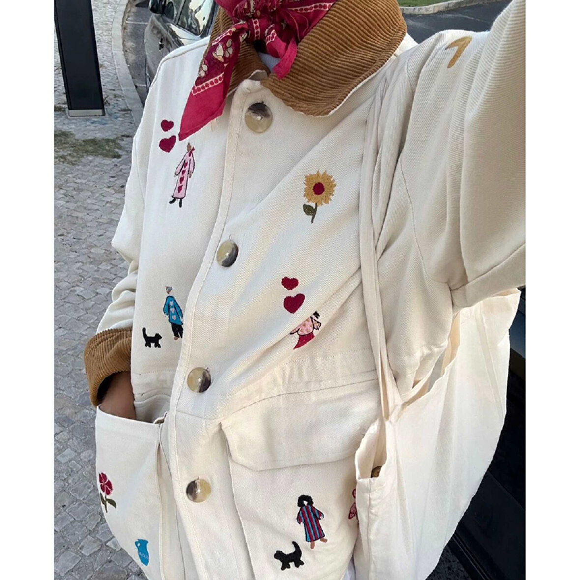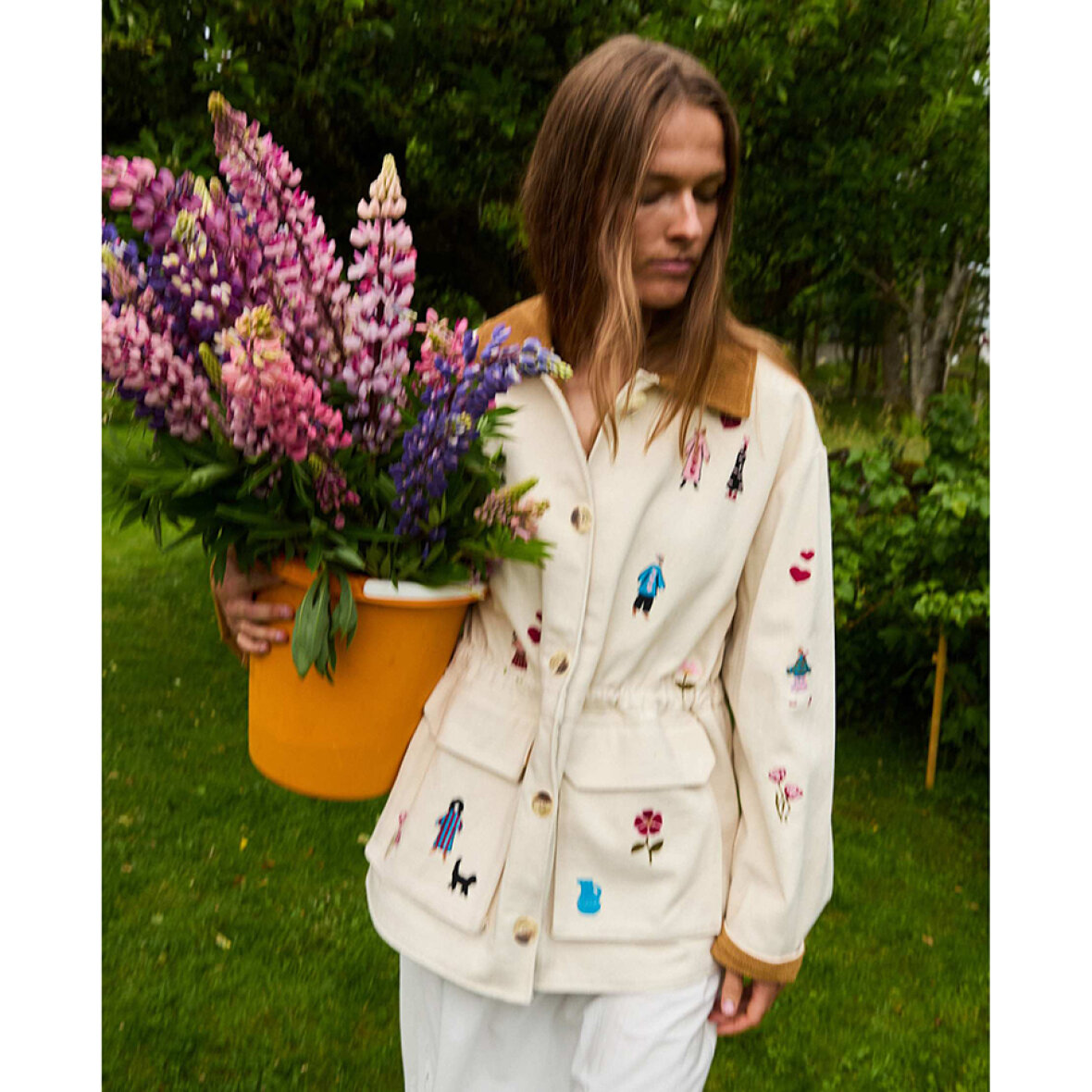 Cara Jacket har en løs pasform med sænkede skuldre og er fremstillet i 100 % økologisk bomuldstwill. Kraven og indersiden af ærmeafslutningerne er foret med overskydende fløjl i en kontrasterende mørk farve, som bliver synlig, når ærmerne smøges op. Jakken har to store utility-lommer med klap, foret med overskydende fløjl, samt en snøre i taljen, der giver mulighed for at justere pasformen. Jakken er foret med overskydende bomuld med prikket print. Fine broderede motiver er spredt over hele jakken og fortæller en levende historie fuld af glæde og liv.