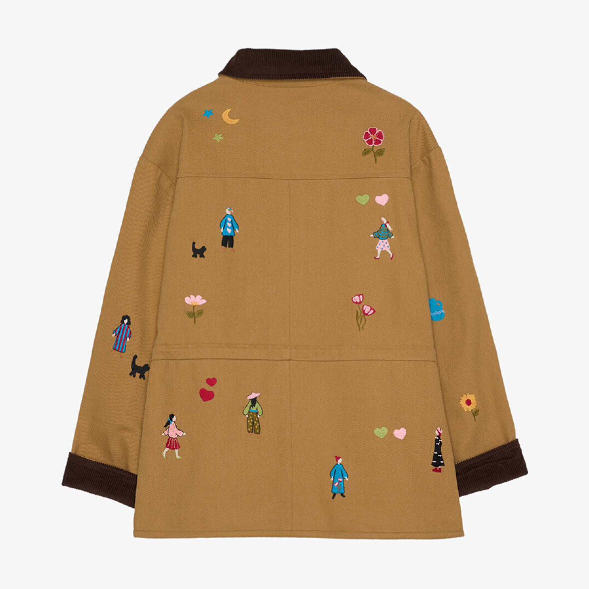 Indvendigt er jakken foret med overskydende bomuld med et diskret prikket print. Fine broderede motiver er spredt ud over jakken og fortæller en levende historie fyldt med glæde og liv.