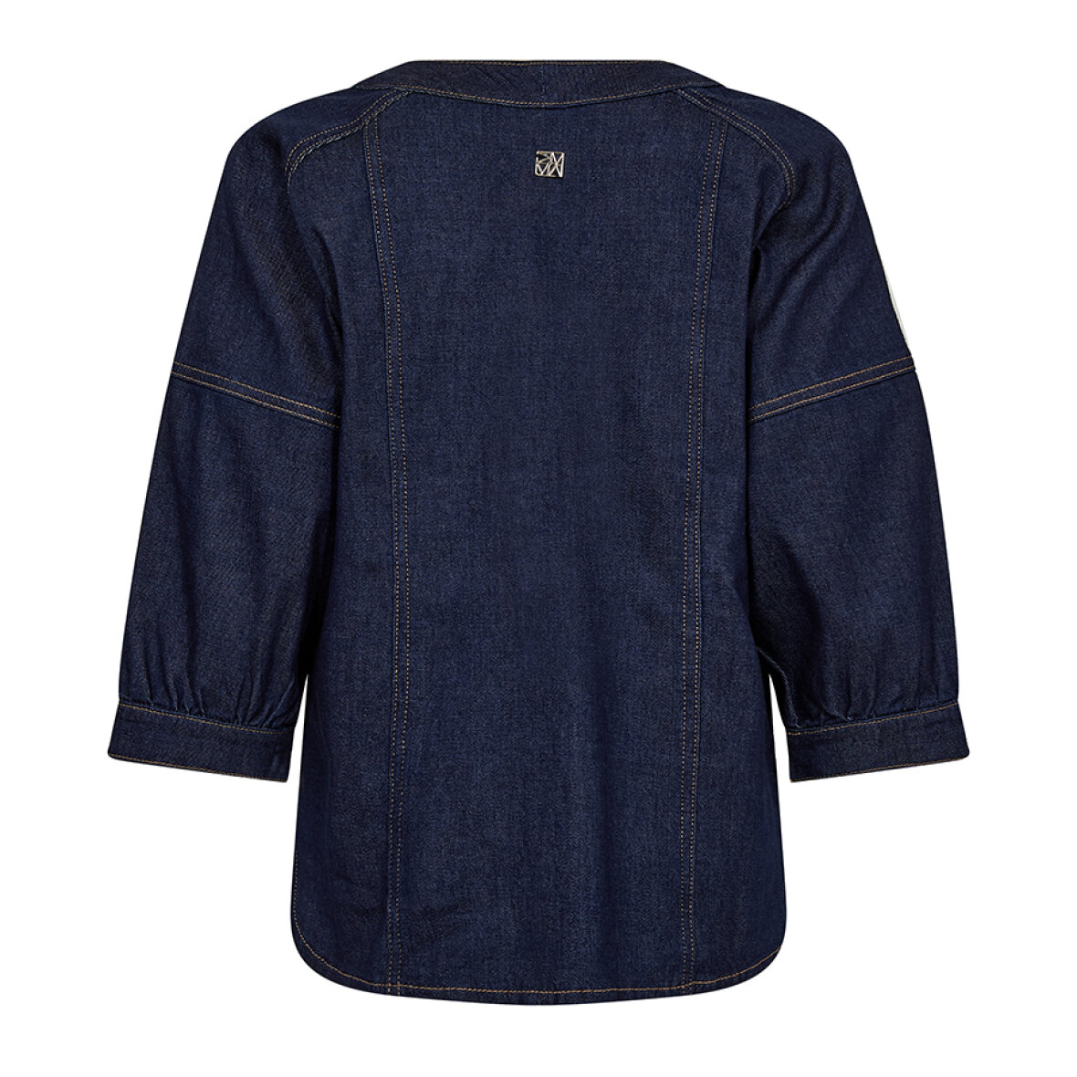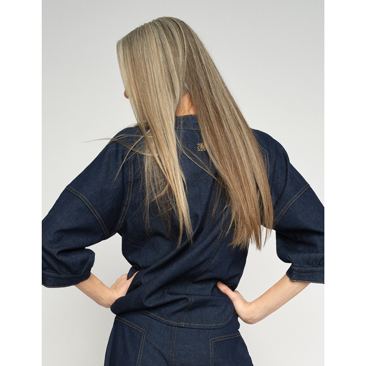 Denne denim-inspirerede skjorte bringer et moderne twist til en tidløs silhuet. Den er designet i en regular pasform med flatterende V-udskæring, knaplukning og diskrete paneldetaljer, der fremhæver formen. De let cropped ærmer tilfører et afslappet, men elegant touch – perfekt til både jeans og skræddersyede bukser.