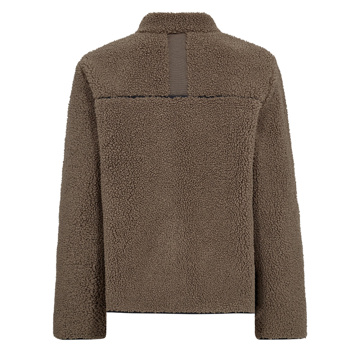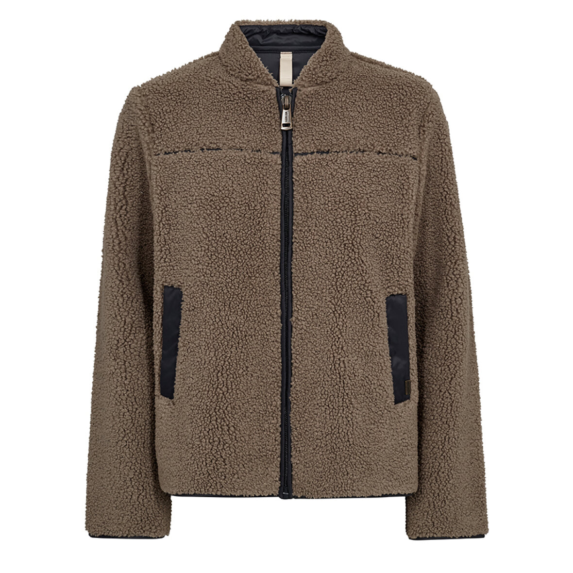 Supercool fleecejakke fra Mos Mosh i smørblødt teddy-materiale. Jakken har en opretstående krave og lukkes med lynlås foran. De fine sorte piping-detaljer giver et moderne udtryk, mens de to stiklommer på fronten – også med sort kant – tilføjer både funktion og stil. Jakken har lange ærmer og en regular pasform, som gør den nem at bruge over både hverdagstøj og lette lag. Perfekt som et ekstra lag på kølige dage.
