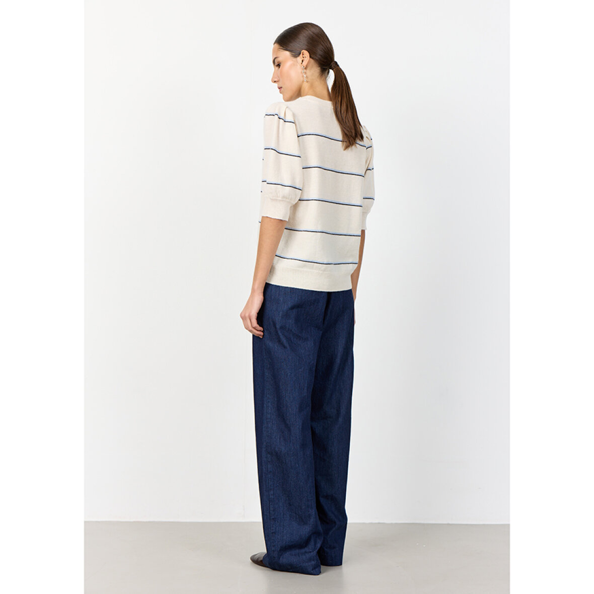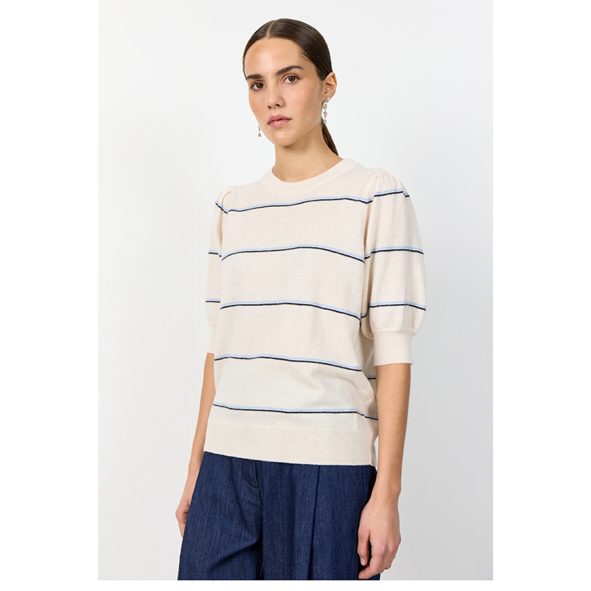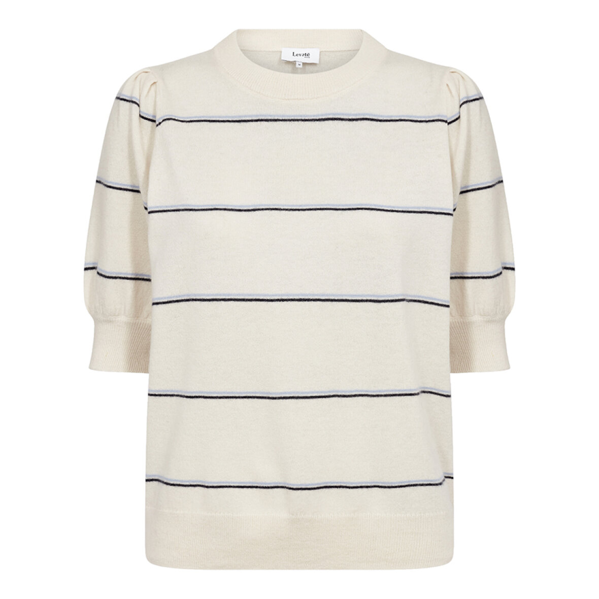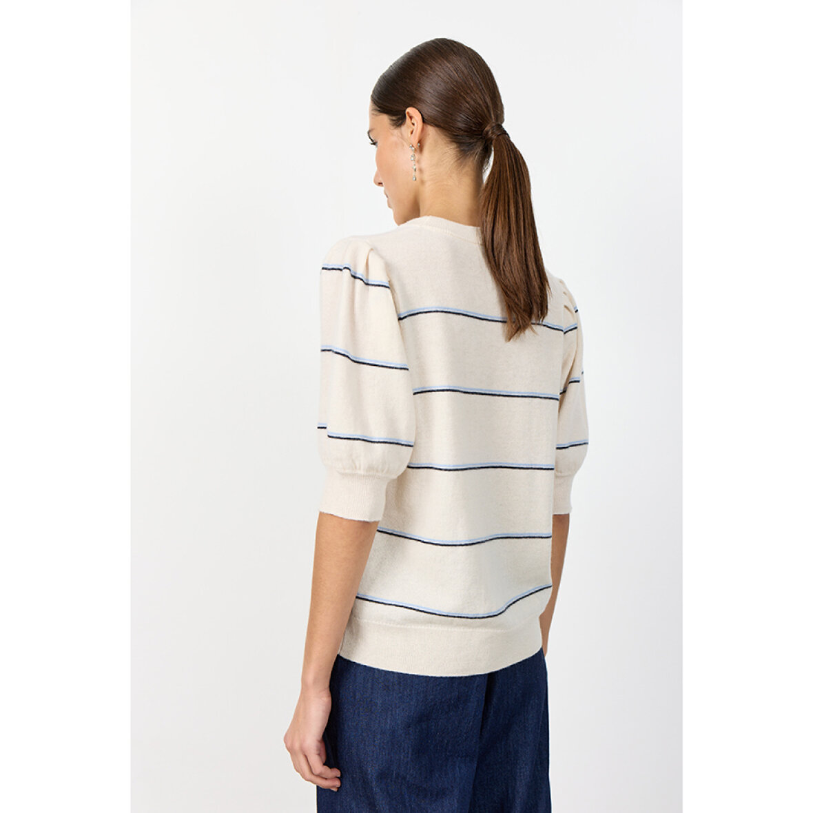 LR-ISMAILA 18 er en cool pullover fremstillet af 100 % merinould. Den har en stilfuld rund hals, subtile puffede korte ærmer og elegante vandrette striber. Sæt denne pullover sammen med skræddersyede bukser eller en nederdel for et raffineret look.
