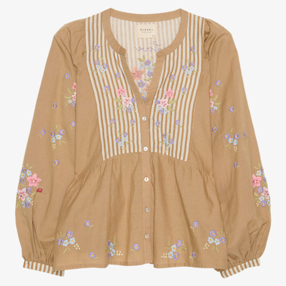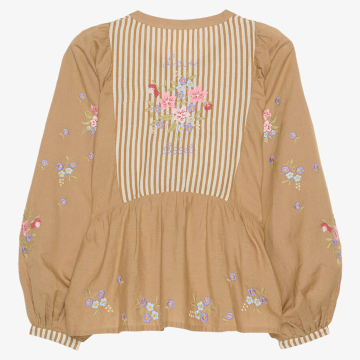 Den lukkes foran med en stolpelukning med lyse perlemorsknapper. Som en særlig detalje er toppen dekoreret med poetiske blomsterbroderier i en kontrastfarve, der er placeret over hele toppen og giver et romantisk og dekorativt udtryk.