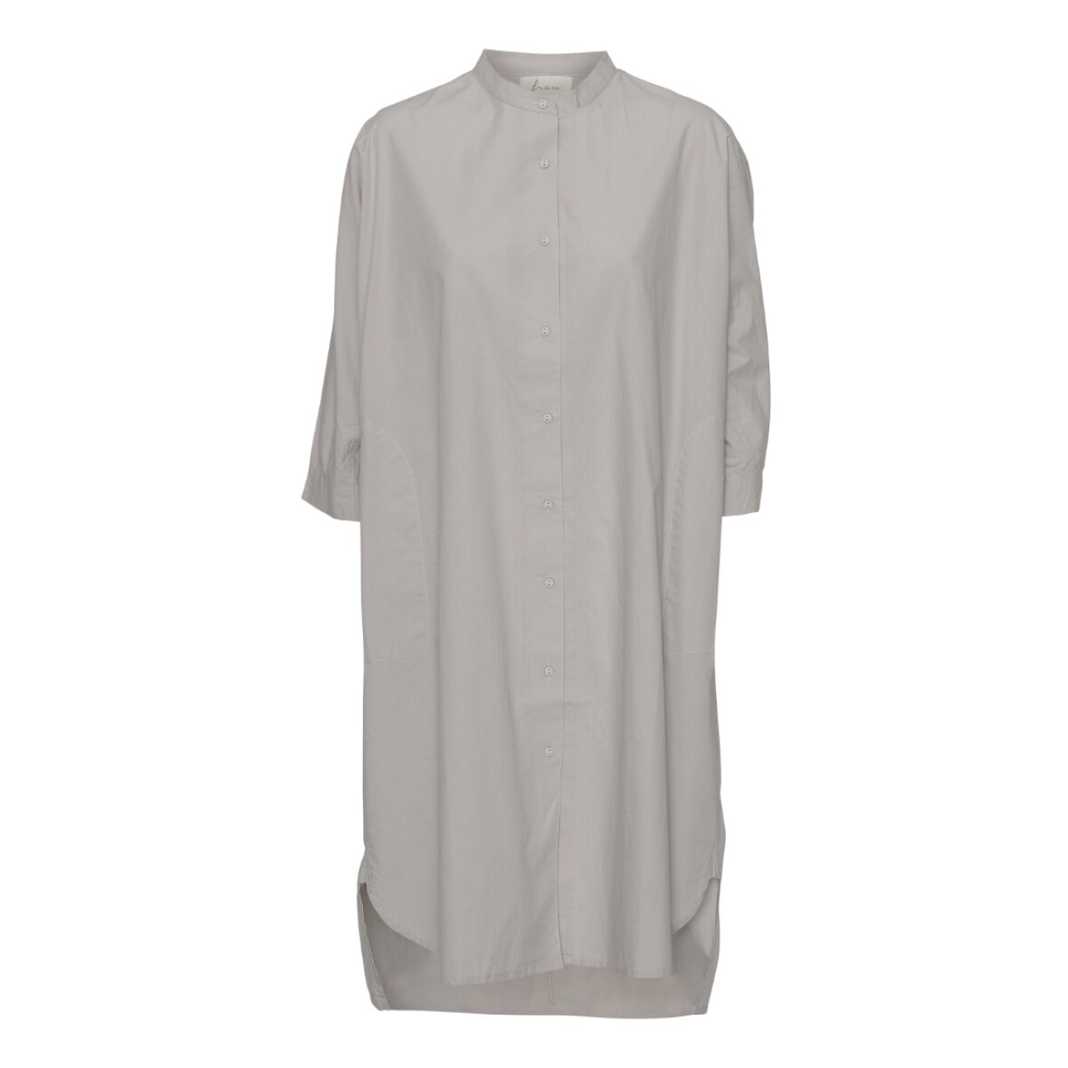 Skjorten har en enkel kinakrave, er gennemknappet på fronten og har karakteristiske skæringer og fine detaljer ved sidelommerne.