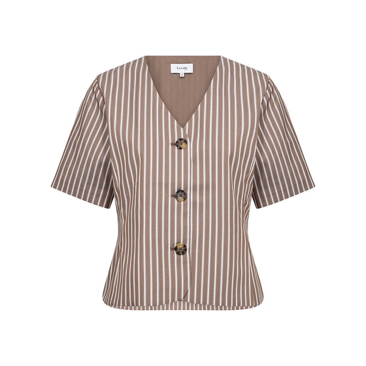 LR-RUCILLE 2 er en bluse fremstillet af 55% polyester og 45% økologisk bomuld. Blusen har en V-hals med brede striber og dristige knapper foran og er designet til at falde lige til taljen. Sæt den sammen med skræddersyede bukser eller en elegant nederdel for et elegant look.