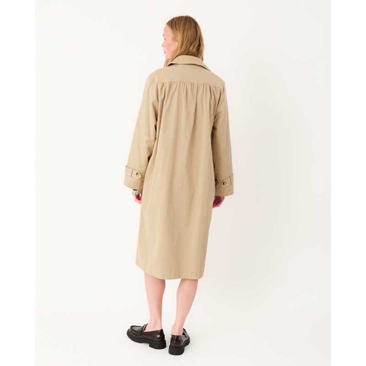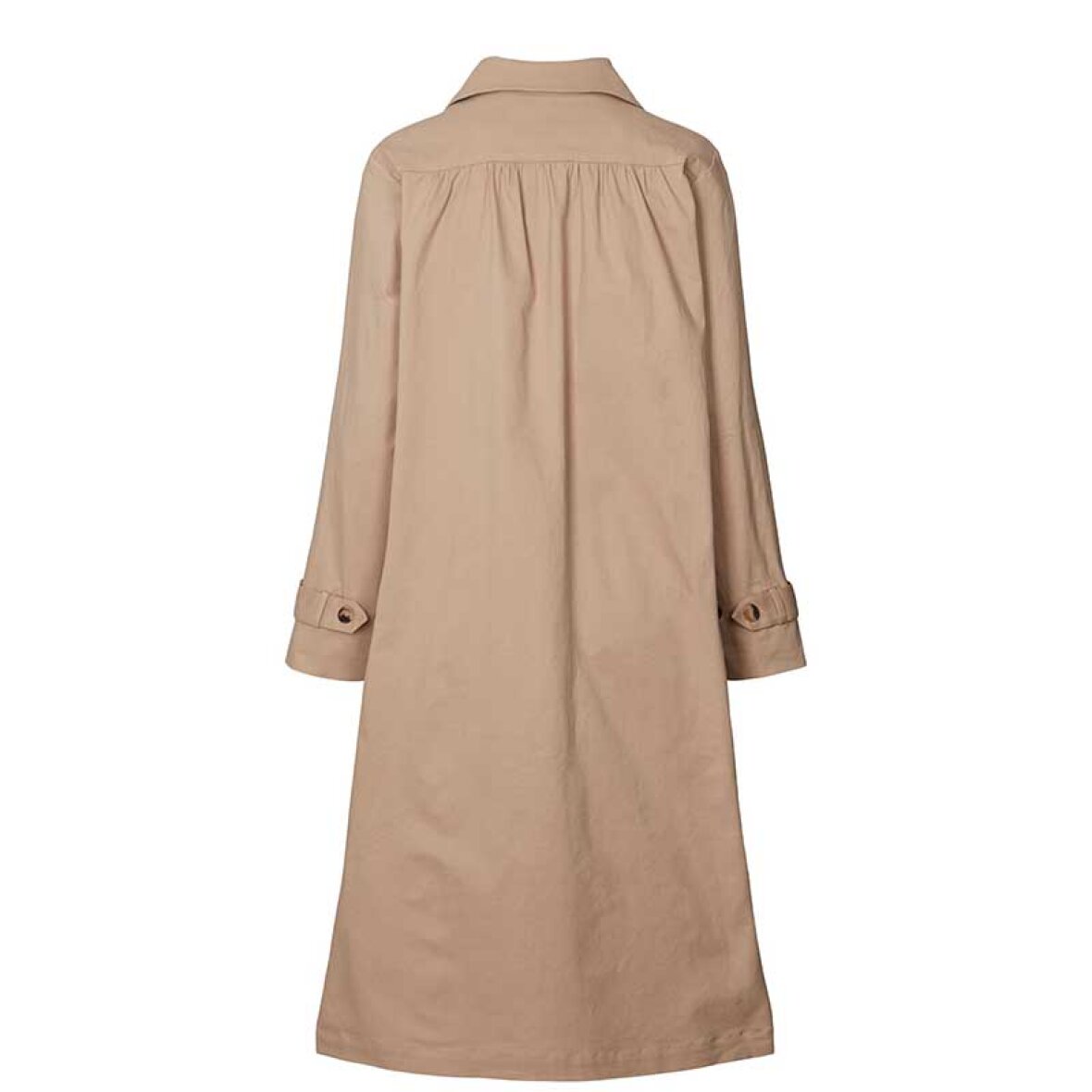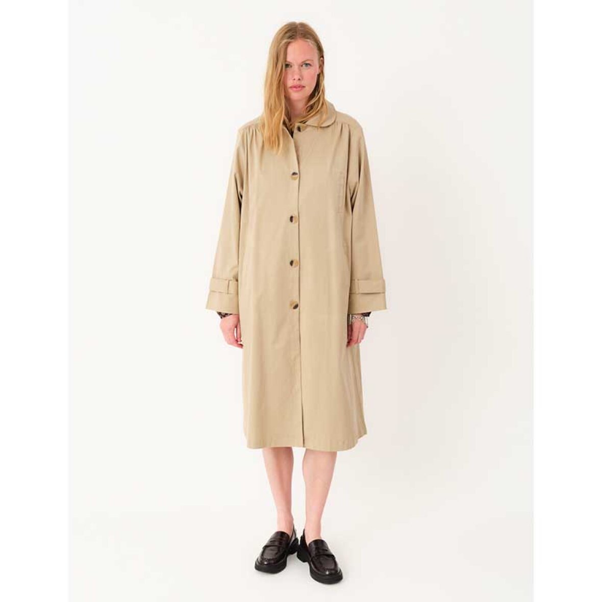 MikalaLL-frakken er en moderne fortolkning af den klassiske trenchcoat med en feminin silhuet og elegante detaljer. Den har afrundet krave, store kontrastknapper, brede manchetter og fine rynker ved skuldre og ryg. Den løse pasform sikrer høj komfort, mens det bløde, strukturerede materiale giver et stilfuldt udtryk.