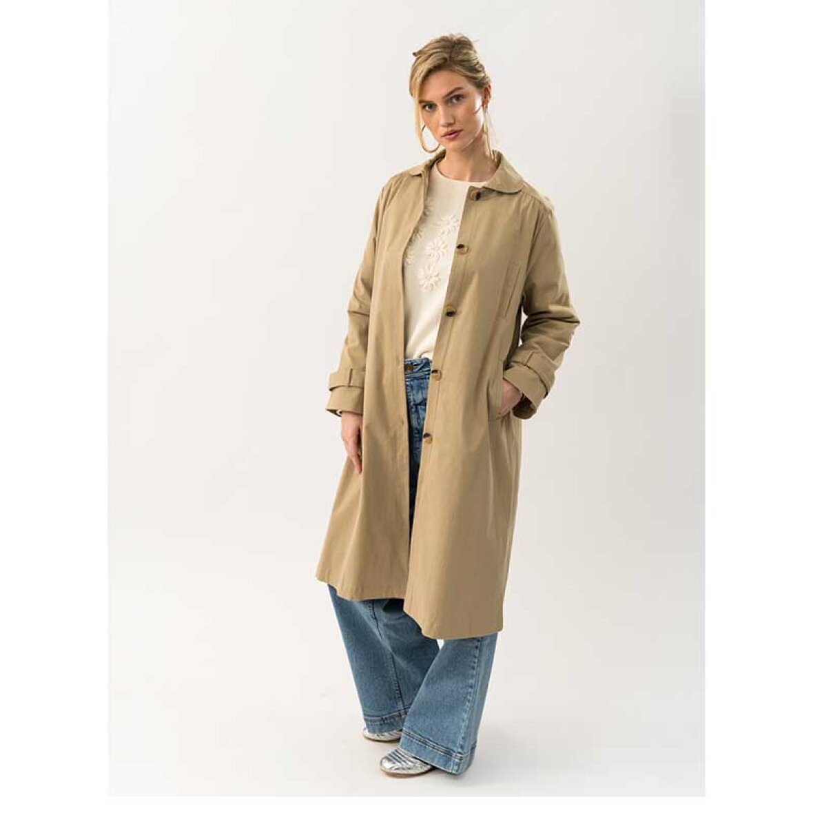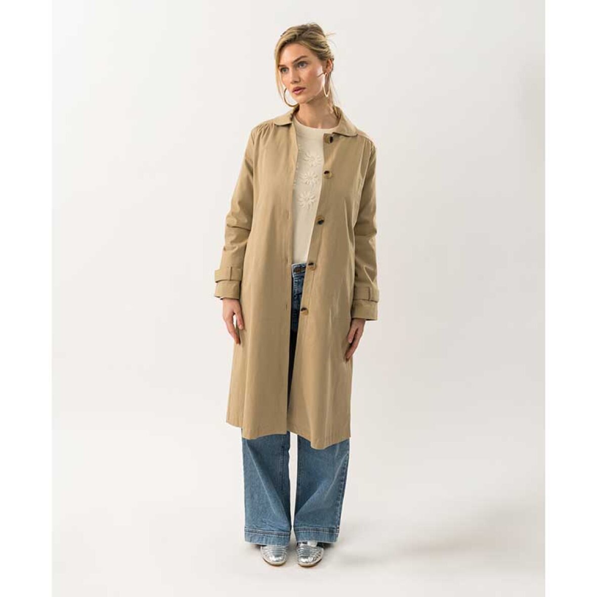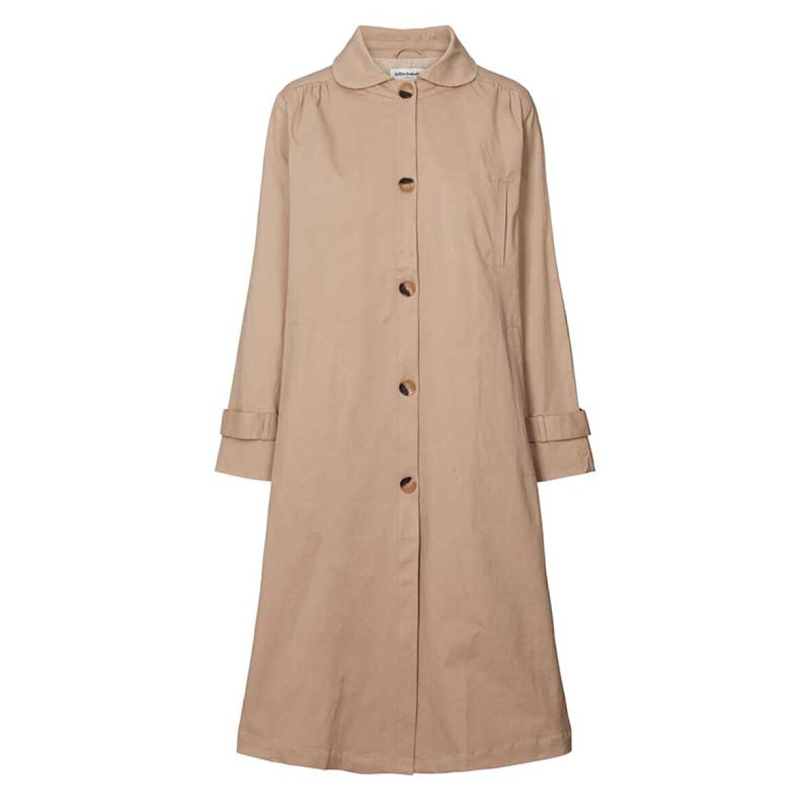 MikalaLL-frakken er en moderne fortolkning af den klassiske trenchcoat med en feminin silhuet og elegante detaljer. Den har afrundet krave, store kontrastknapper, brede manchetter og fine rynker ved skuldre og ryg. Den løse pasform sikrer høj komfort, mens det bløde, strukturerede materiale giver et stilfuldt udtryk.
