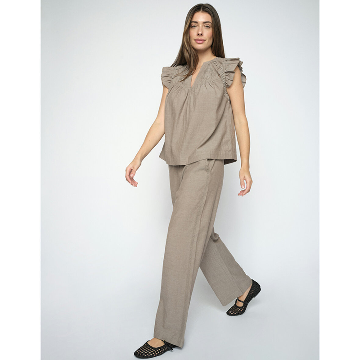 Disse bukser er designet i en let og behagelig kvalitet med en afslappet, regulær pasform, der sikrer komfort hele dagen. Den elastiske talje og den melerede struktur giver et ubesværet og moderne udtryk med et blødt fald. Perfekte til både hverdagsbrug og afslappede, velklædte looks – style dem med en let bluse eller en enkel strik for et harmonisk outfit.