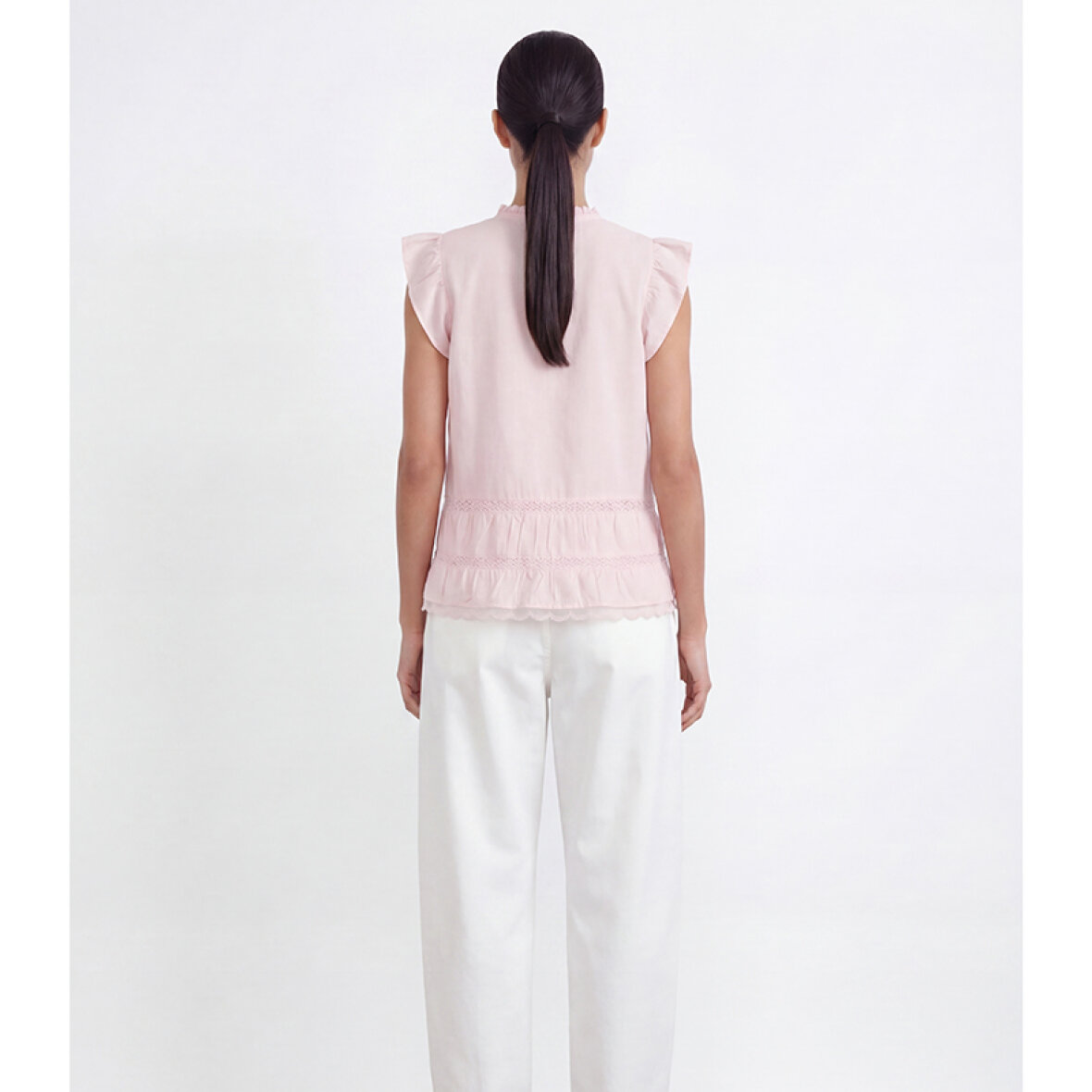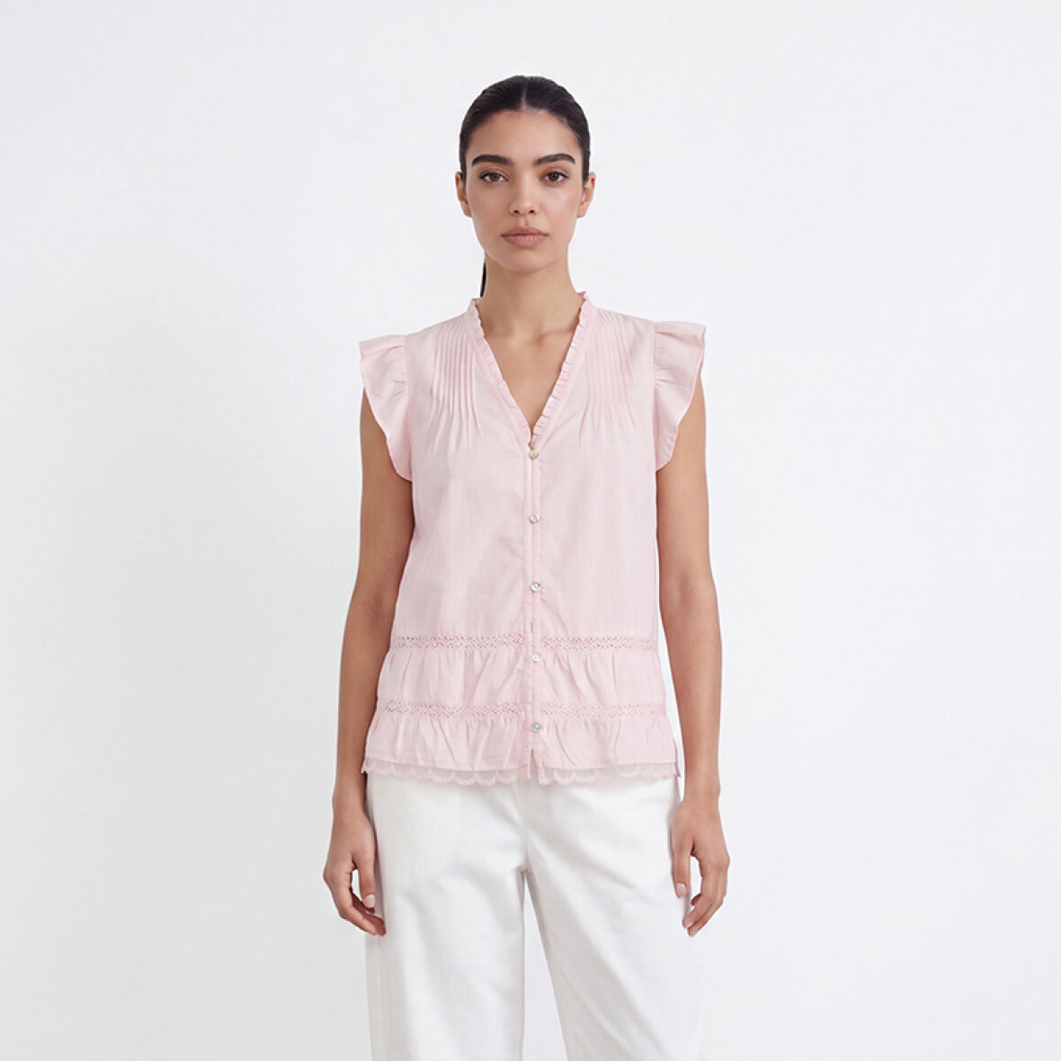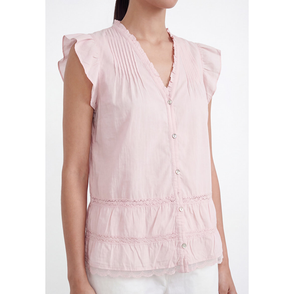 LR-ROSY 2 er en feminin bluse fremstillet af 100 % økologisk bomuld. Den har fine flæsedetaljer ved skuldrene, V-hals med knaplukning og fine blondeindsatser langs kanten. Sæt den sammen med dine yndlingsjeans eller en elegant nederdel for et afslappet, men elegant look.