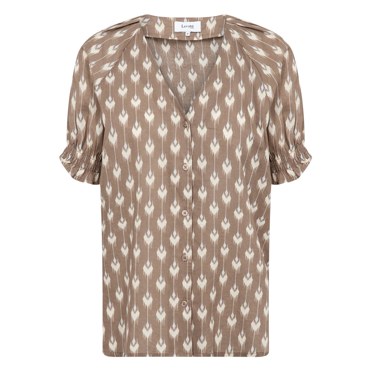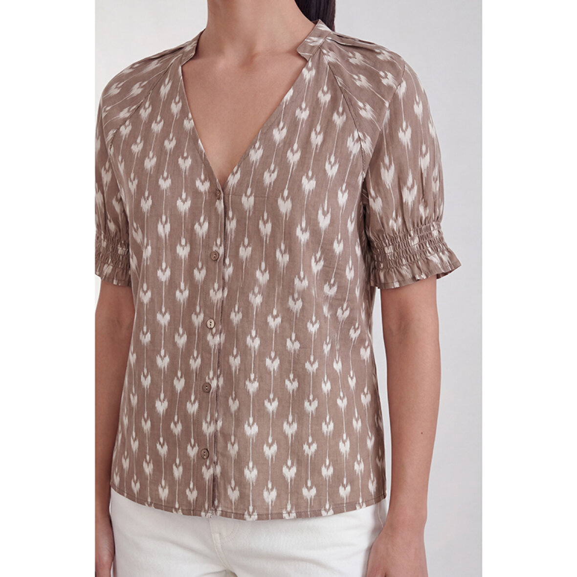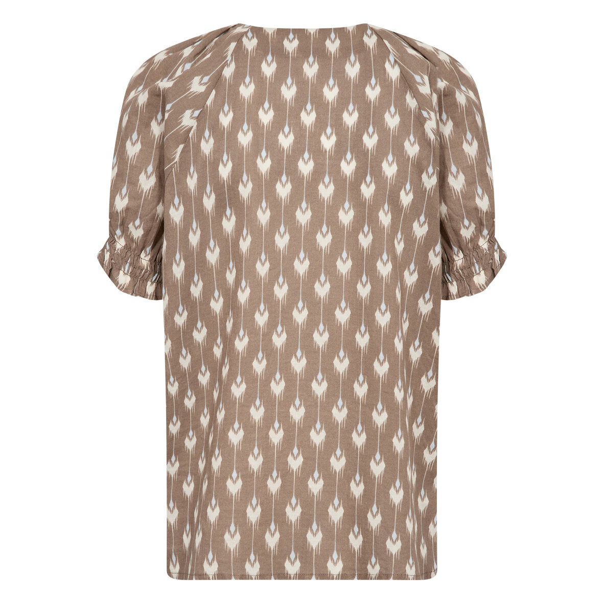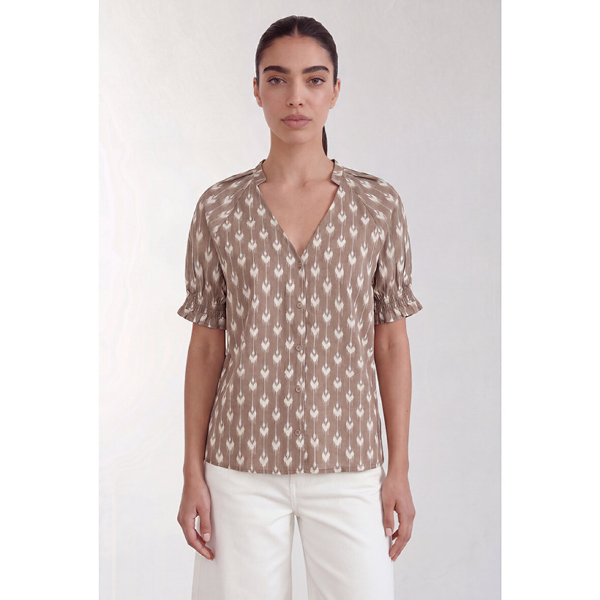 LR-RINNI 2 er en bluse fremstillet af 100% bomuld. Blusen har V-udskæring, knaplukning foran og korte ærmer med rynkede manchetter, prydet med et elegant geometrisk print. Sæt den sammen med skræddersyede bukser for et sofistikeret look, eller brug den med jeans for en mere afslappet stil.